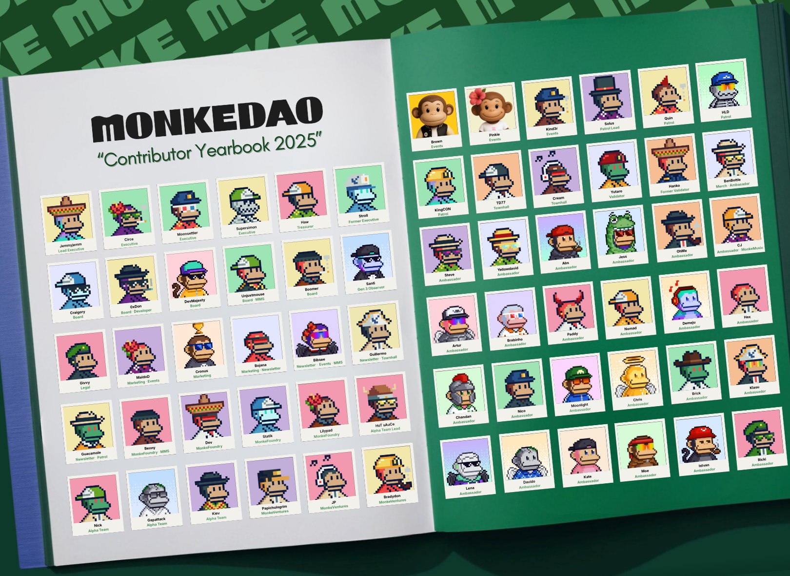 There are 4 total executive positions, and each member is expected to serve the vision of the community, put voted proposals and surveys into action, incorporate and maintain MonkeDAO as an entity, and serve on DAO committees as a representative of the community.